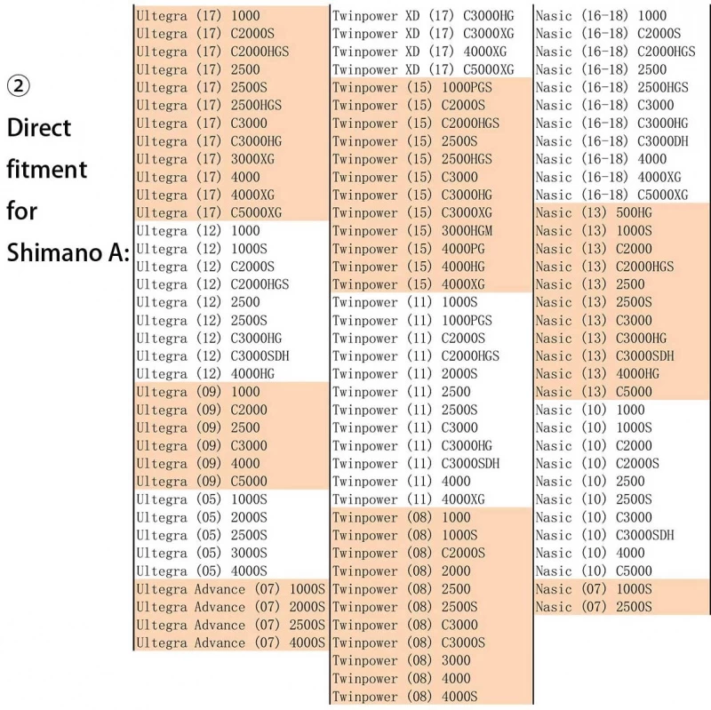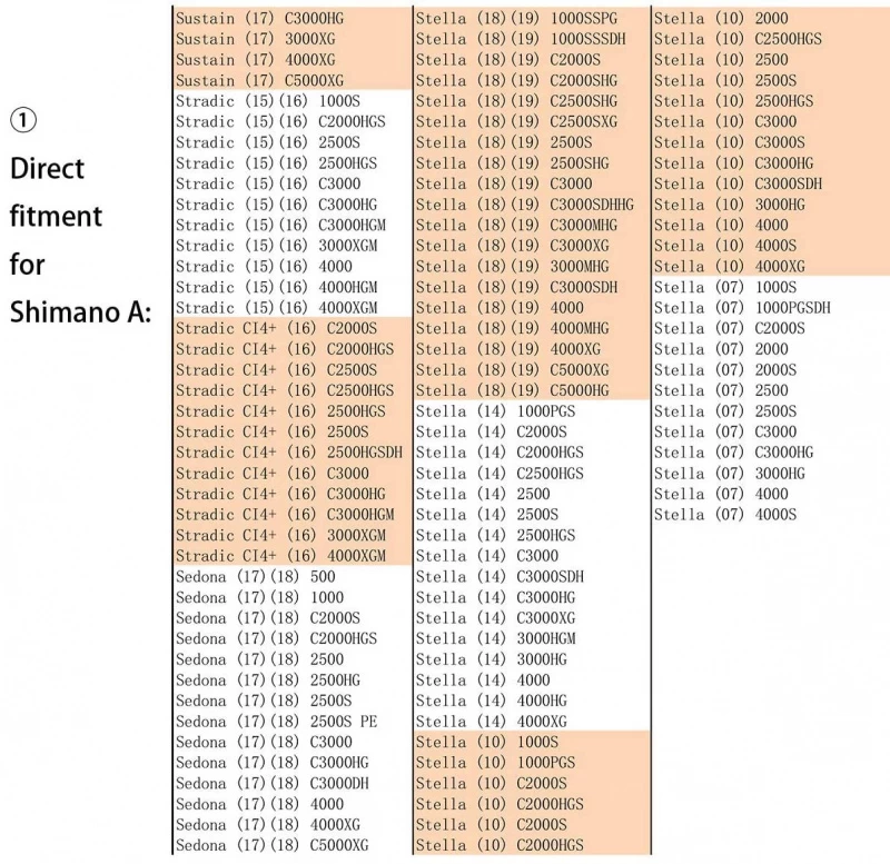 Directe aanpassing voor Shimano Spinning reel Handvat A: (16) Stradic CI4+ 1000 – 4000?(06) Sephia 2500, (09) Sephia 3000, (08) (10) (12) (17) Sephia CI4+ 3000, (07) Sephia BB 2500,(10) (11) (13) (18) Sephia BB 3000