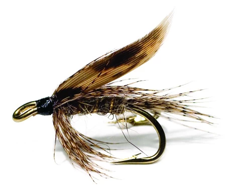 March Brown Grey. Klassieke forel vliegen gebonden op een bruine, down eyed dubbele Mustad haak.