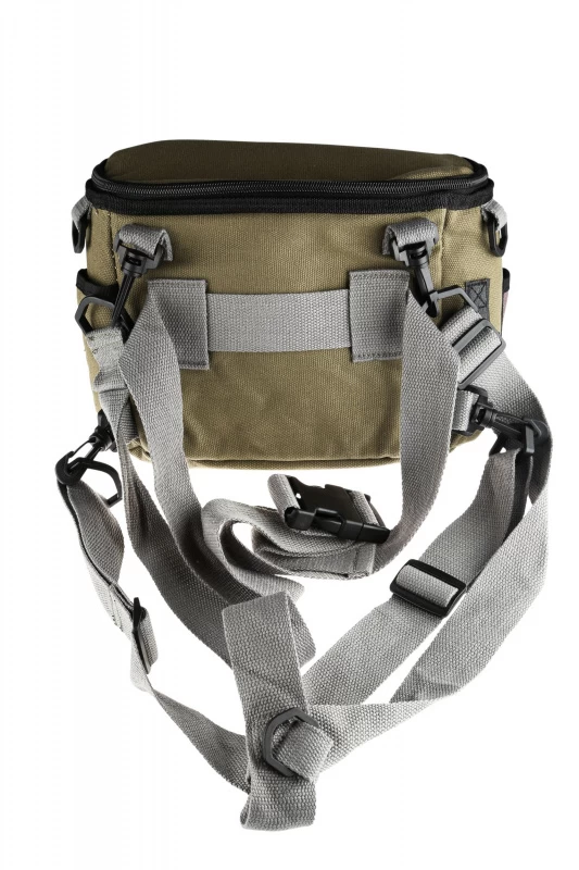 Tas van katoenen canvas dat is geïmpregneerd om goed bestand te zijn tegen regen. Met veel goede opbergruimtes en houders voor peang, lijnenschaar, enz.