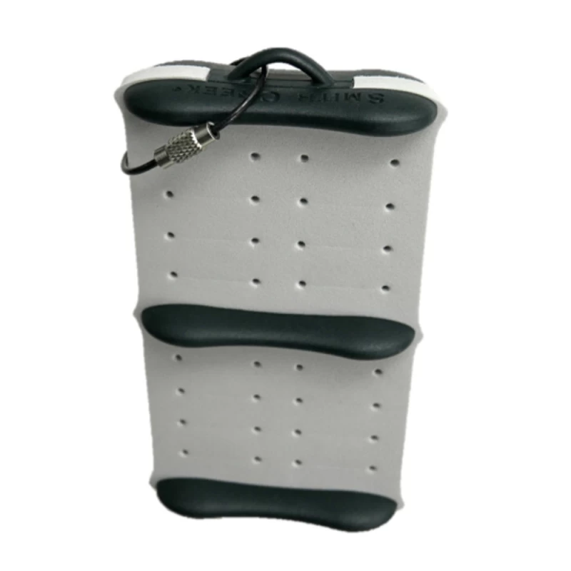 Double-sided… het houdt veel vliegen binnen een ergonomische en aanpasbare vorm. Vliegen worden veilig vastgehouden in op maat gemaakte micro-split schuim en beschermd tegen schade of verlies door de gepatenteerde blootgestelde ribben. Bevestig het aan een koord, een vest D-ring of een zinger, it’s uitzonderlijk makkelijk te gebruiken met ongeëvenaarde toegang tot beveiligde vliegen. It’s ontworpen om te worden gedragen op vesten of kleding, borst / sling packs. Een roestvrijstalen bevestigingskabel is voorzien.