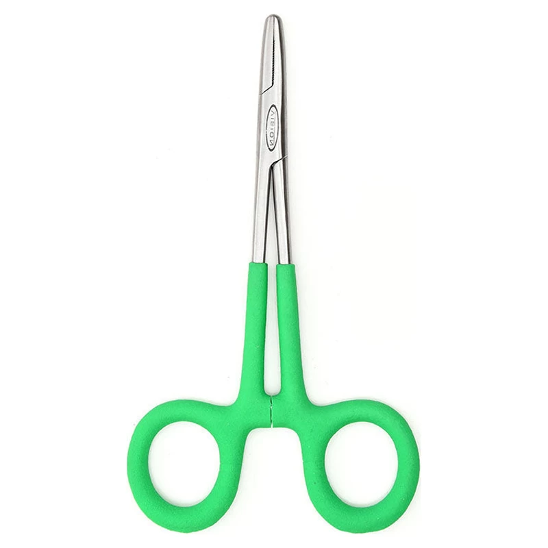 Het kaakoppervlak is vlak vanaf het puntgedeelte om de vlieg te beschermen bij het onthaken van je vangst en gekarteld vanaf de achterkant, wat een goede grip biedt wanneer er zwaarder gedraaid en gewerkt moet worden. Er’s ook een naald aan de achterkant van de kaken voor het schoonmaken van vliegenogen. De greep heeft een zachte, heldergroene coating voor comfortabel gebruik.