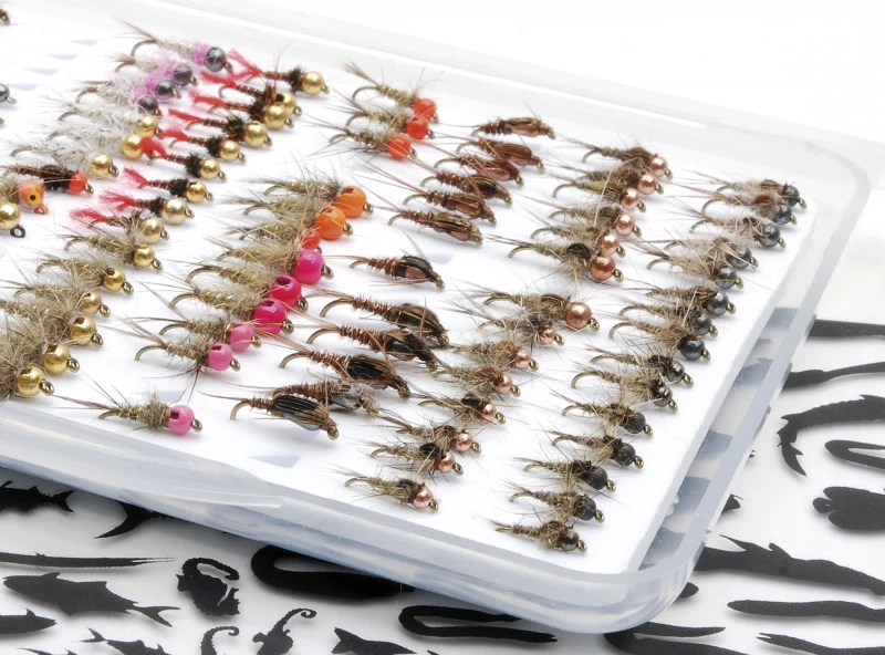De doosjes zijn versierd met een speciale viscamoprint. De Slim-serie bevat een speciale doos met een magnetische bodem om te voorkomen dat de vliegen/haken eruit vallen.