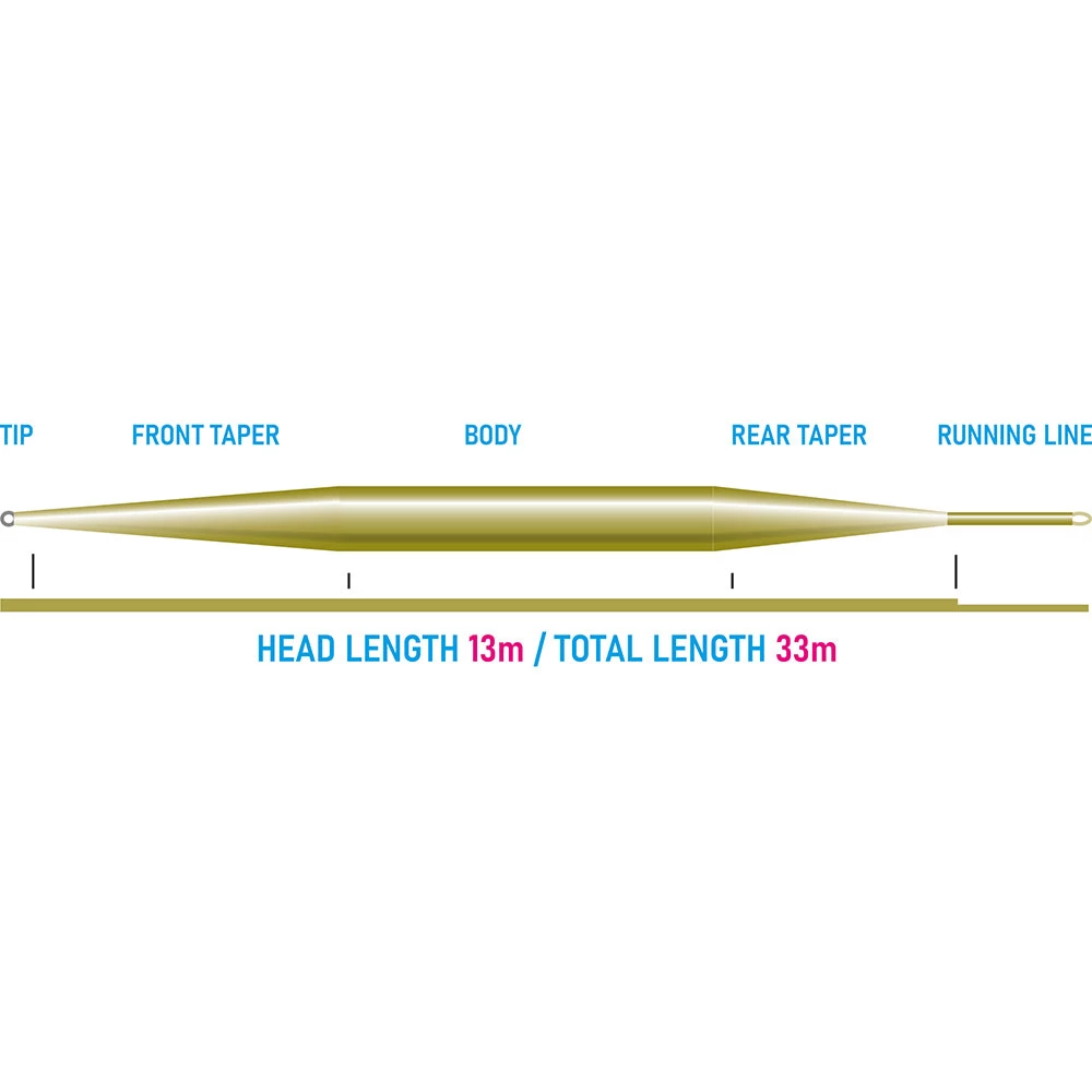 De totale lengte van 33m zorgt ervoor dat zelfs de beste werpers niet zonder lijn komen te zitten. Aan de voorkant van de lijn hebben we een eerste tippet ring bevestiging voor de leader. Zeer kleine, soepele en soepele manier om de leader aan de vliegenlijn te bevestigen. SloMo, Fast Inter, Sink 3 en Sink 5 hebben allemaal dezelfde kleur, dit houdt je geheime wapen verborgen voor spiedende ogen omdat het onmogelijk is om de zinksnelheid van veraf te herkennen. De kleur van de sleeve achter de voorste tippetring en de opdruk erop zorgen ervoor dat alleen jij weet welke zinksnelheid je gebruikt.